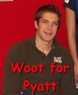 Pyatt was totally cool and yet the total opposite of cold at the same time, if you catch my drift. If you don't just ask me to explain it to you. The whole thing was completely different from the experience I had at the Jovo signing last year. It was way more relaxed, they let us take pictures and you could get more than one item autographed. Pyatt himself was really nice, I congratuated him on his performance so far this season and he genuinely seemed to be thankful. He even asked Becca and I how we were doing and other small talk like that. Then after he autographed our stuff we got to take a picture with him. I sat down in the seat next to him and I kind of lean up against him. All I can say is "Holy muscles Batman!" He was like rock solid, and Becca said the same thing because she bumped into him aswell. She claims it was purely accidental, I'm not convinced. We were really lucky to get in before he left, because he had "other engagments" to attend to and had to leave at 3:30.